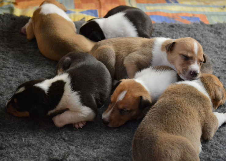 Našich 7 statečných se má čile k světu, jsou to malá spokojená stvoření, která pořád na střídačku baští a spinkají. Nemůžeme se té roztomilosti vůbec nabažit. :-) Dnes je to týden od jejich narození. Zatím je máme v porodní bedně v obýváku vedle gauče a neustále s nimi někdo je. I v noci je přikládáme na kojení a dohlížíme, aby všechna měla dostatek mléka a aby nikdo nezůstal pozadu. Až trochu povyrostou, přesunou se do vlastního pokoje s přístupem na zahradu. Ten jsme přistavěli před 2 lety speciálně kvůli štěňatům.