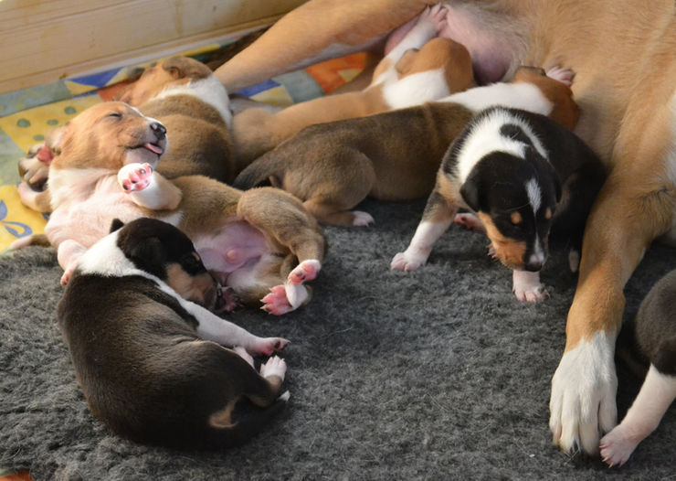 Narodilo se nám 7 štěňátek - 2 kluci (zlatí), 5 holčiček (2 zlaté + 3 trikolorní). Štěňátka jsou krásná, silná, čilá a Ebinka o ně pečuje zkušeně a s láskou. Máme z nich obrovskou radost! :-)